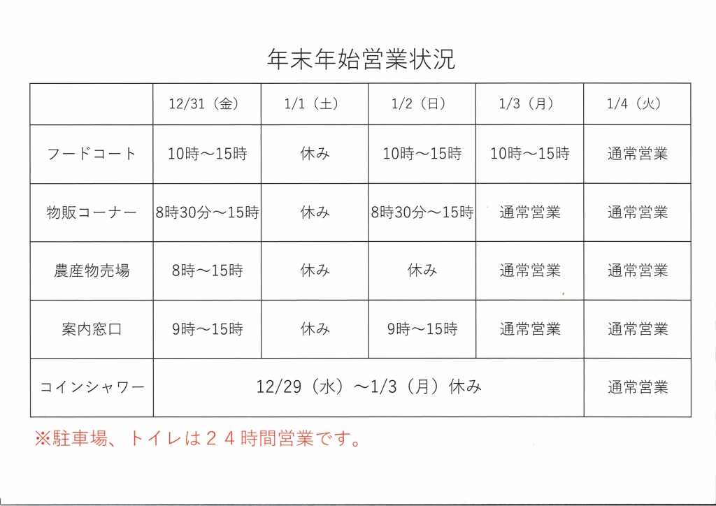年末年始の営業について 2021 12/13 お知らせ 2021.12.13 2021.12.13 年末年始の営業は下記の通りです。 お知らせ よかったらシェアしてね! URL Copied! URL Copied! 「里山の四季展」開催中🖼 新メニューのお知らせ 関連記事 ベジタブル・フルーツカービング作品展 2022.08.12 GWは地域農産物売場へ🌼 2025.04.22 明日は紙芝居の日! 2022.07.02 信州フェア開催中🌰 2023.09.16 ドッグランのお知らせ🐶 2021.12.01 ドッグランのお知らせ 2022.11.15 ドッグラン冬期閉鎖のお知らせ🐶 2024.11.22 手相鑑定してみませんか?✋ 2023.10.24