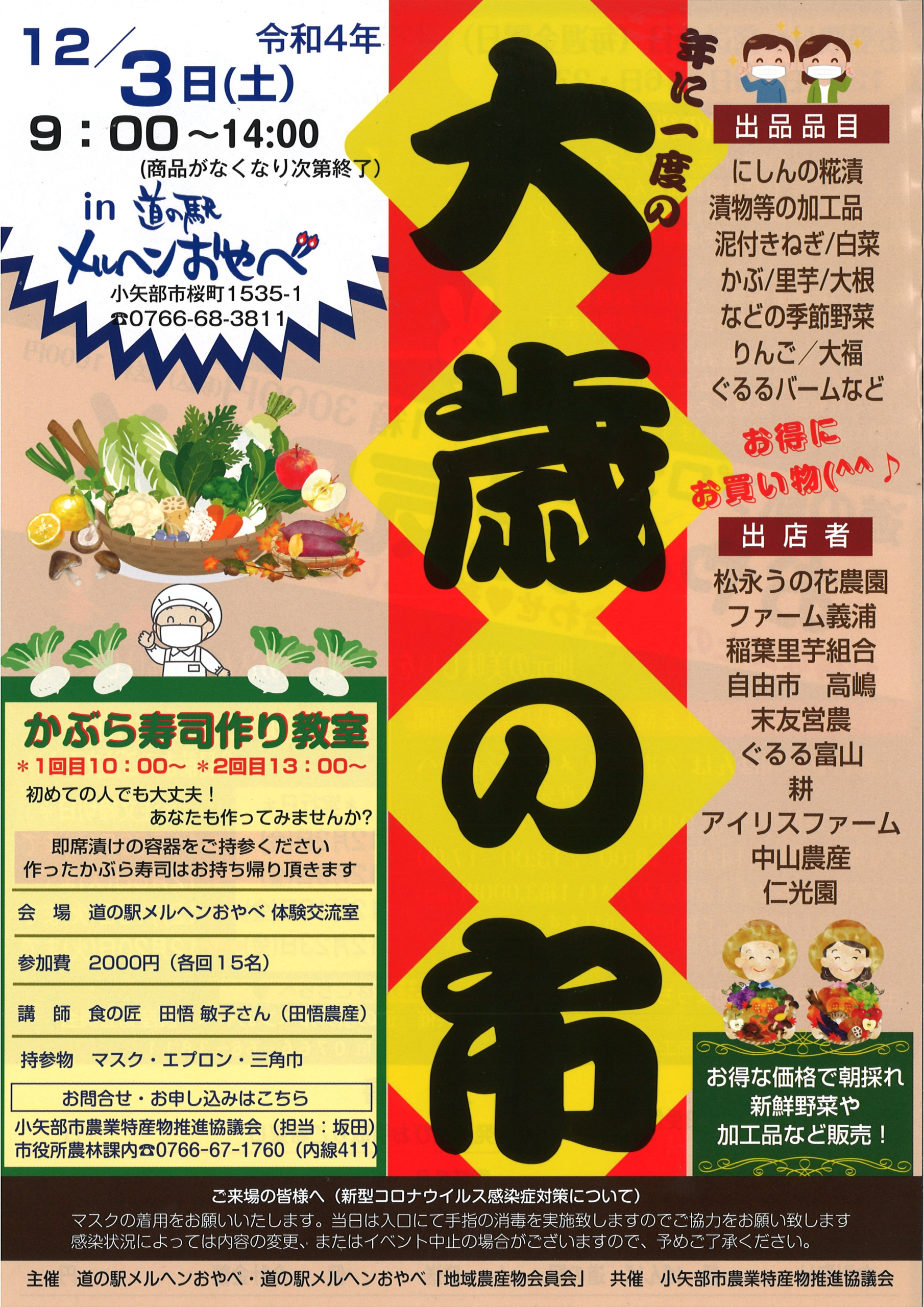 GW!アコースティック野外ライブ開催♪ 2022 4/19 イベント情報 2022.04.19 2022.04.19 5月3日(火)と4日(水)「アコースティック野外ライブ」を開催! 北陸のバンド15組が演奏、観覧は無料!ぜひご来館ください。 イベント情報 よかったらシェアしてね! URL Copied! URL Copied! 浮世絵展開催中 農産物売場よりお知らせ 関連記事 大歳の市開催! 2022.11.27 12/7 大歳の市&かぶら寿司教室開催🥬 2024.11.16 お盆切り花市🌼 2023.08.09 メルヘン昼市 新米祭り開催🍚 2023.09.25 10/5(日)ありがとうマルシェ開催☆ 2025.09.09 3/2 えごま味噌の五平餅販売します! 2025.02.11 音楽イベントのお知らせ 2023.11.06 ※中止※年末!軽トラ市開催! 2022.12.13