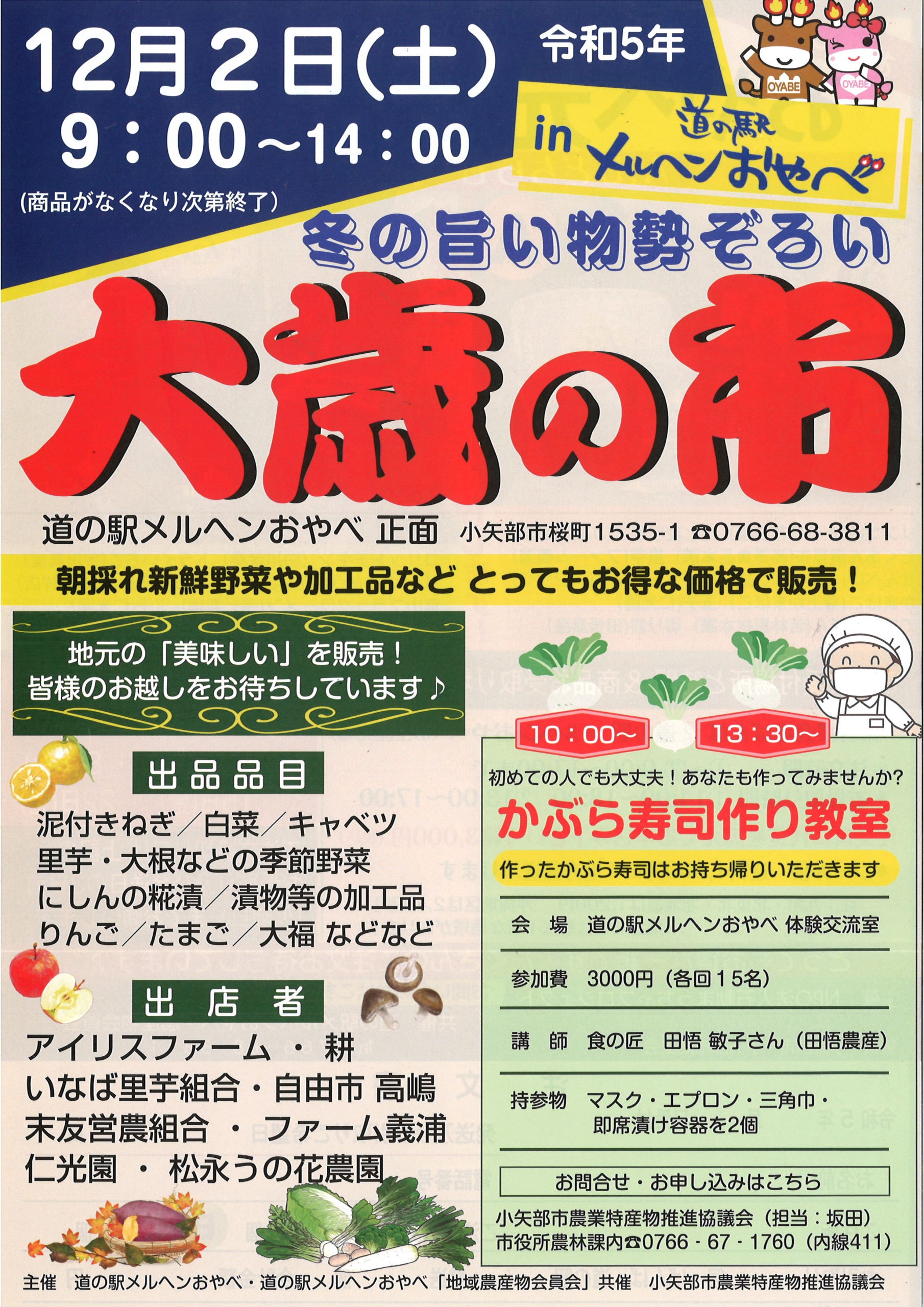 大歳の市開催! 2022 11/27 イベント情報 2022.11.27 2022.11.27 今年もやります!大歳の市! とれたての冬野菜や地元の加工品が勢ぞろい! お買い得ですよ♪ぜひお越しください。 大歳の市 令和4年12月3日(土)9時~14時(商品がなくなり次第終了) イベント情報 よかったらシェアしてね! URL Copied! URL Copied! となみ野道の駅スタンプラリー開催 道の駅“元気ボックス”の注文受付中! 関連記事 予告 2022.07.26 歳末クリスマスライブ開催🎄 2023.12.12 防災パークin道の駅メルヘンおやべ開催🚒 2023.06.27 28日はイベント盛りだくさん! 2021.11.23 「メルヘン水彩画展」開催🖼 2023.12.10 音楽イベント開催♪ 2022.09.04 暑いですが、青空古本市開催!📚 2023.08.01 冬の食彩まつり!大歳の市&おやたまるしぇ🥬 2023.11.24