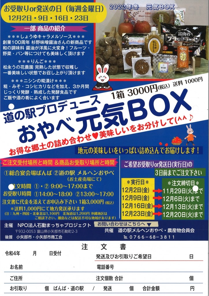 道の駅“元気ボックス”の注文受付中! 2022 12/03 お知らせ 2022.12.03 2022.12.03 道の駅の商品を詰め合わせたギフトボックスの注文を受け付け中です! お歳暮にいかがでしょうか? ご注文の方は、道の駅物販コーナーへお越しください。 お知らせ よかったらシェアしてね! URL Copied! URL Copied! 大歳の市開催! ※中止※年末!軽トラ市開催! 関連記事 ドッグラン利用について 2021.04.01 ドッグラン再開について🐶 2025.03.07 お盆期間中は切り花市&種プレゼント🌼 2025.07.29 施設利用料金変更のお知らせ 2024.02.14 ドッグランのお知らせ 2023.03.06 手相鑑定してみませんか?✋ 2023.10.24 受付中♪おやべ元気BOX🎁 2024.11.19 道の駅記念きっぷ🎫 2022.07.26