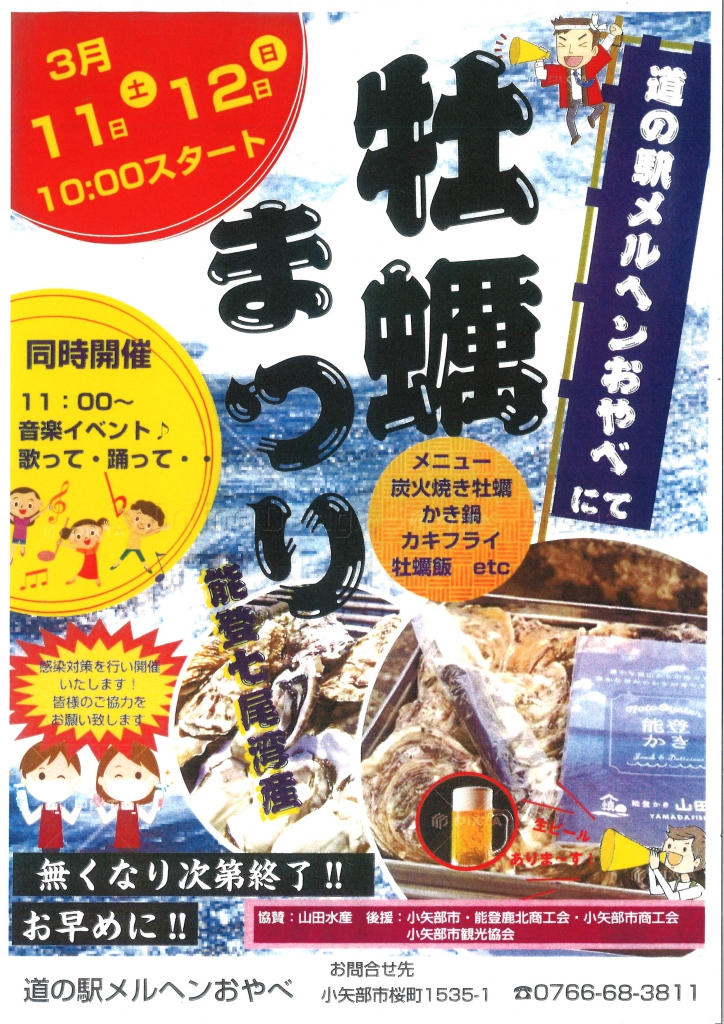 牡蠣祭りのお知らせ 2023 3/05 イベント情報 2023.03.05 2023.03.05 3月11日と12日「能登牡蠣祭り」開催! 炭火焼き牡蠣はもちろん、かき鍋やカキフライもあるよ♪ 10時スタート!無くなり次第終了です。ぜひお早めにお越しください。 ご来館をお待ちしております。 詳しくは下記チラシを! イベント情報 よかったらシェアしてね! URL Copied! URL Copied! 営業時間のお知らせ ドッグランのお知らせ 関連記事 食べて応援!能登牡蠣まつり開催決定! 2024.02.17 予告 2022.07.26 石動高校文化部合同展開催🖼 2025.03.11 音楽イベントのお知らせ♪ 2023.05.10 石動高校文化部「iカルチャー展」のお知らせ 2022.03.05 6/1(日) ありがとうマルシェ開催♪ 2025.05.17 夏の古本市開催! 2023.07.04 小矢部市制60周年展示 2022.07.31