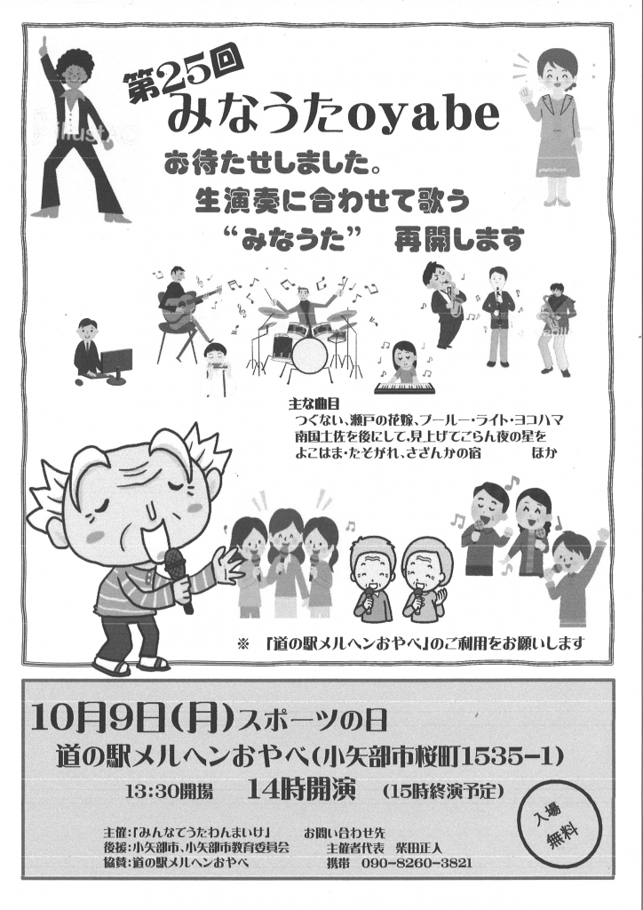 みんなでうたわんまいけ♪ 2023 9/25 お知らせ 2023.09.25 2023.09.25 久々に帰ってきました「みなうたOYABE」 生演奏に合わせてみんなで歌いましょう♪ 開催日:10月9日(日)13時30分開場~ 入場無料です。ふら~っとお立ち寄りください。詳しくは下記チラシを! お知らせ よかったらシェアしてね! URL Copied! URL Copied! メルヘン昼市 新米祭り開催🍚 直売所よりうれしいお知らせ🍠 関連記事 かみしばい上演会開催 2022.06.04 物販コーナーよりお知らせ 2024.05.21 よってかれマーケットへ参加! 2022.06.18 フードコートのお知らせ 2023.06.16 紙芝居上演&太鼓演奏会 2022.08.29 ドッグラン冬期閉鎖のお知らせ🐶 2024.11.22 夏のおやべ元気BOX受付中! 2022.06.18 物販、コインシャワー営業時間変更のお知らせ 2024.10.29