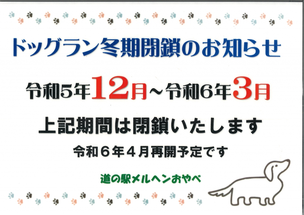 ドッグラン冬期閉鎖のお知らせ 2023 11/18 お知らせ 2023.11.18 今年度もドッグランをご利用いただきありがとうございました。 ドッグランは冬期間(12月~3月)閉鎖いたします。 再開日は天候状況により前後いたします。 決まりましたら、ホームページ、張り紙などでお知らせいたします。 お知らせ よかったらシェアしてね! URL Copied! URL Copied! おやべ元気BOX受付中! 物販コーナーよりお知らせ 関連記事 みんなでうたわんまいけ♪ 2023.09.25 ドッグラン再開について🐶 2025.03.07 急速充電器点検のお知らせ 2024.07.01 お盆期間中は切り花市&種プレゼント🌼 2025.07.29 年末年始のお知らせ 2023.12.12 受付中♪おやべ元気BOX🎁 2024.11.19 新メニューのお知らせ 2021.12.14 かみしばい上演会開催 2022.06.04