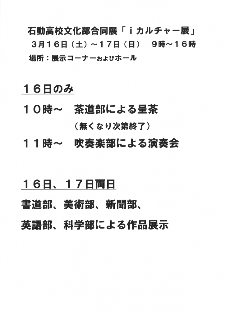 石動高校文化部合同展「iカルチャー展」開催 2024 3/12 イベント情報 2024.03.12 2024.03.12 今週末は地元の石動高校文化部の生徒さんによる合同展を開催! 吹奏楽の演奏会や茶道部によるお点前の披露、また、書道部や美術部の作品展示など! ぜひご覧ください。 イベント情報 よかったらシェアしてね! URL Copied! URL Copied! 外構修繕工事のお知らせ※追記あり 令和6年4月からの営業時間について 関連記事 石動高校文化部「iカルチャー展」のお知らせ 2022.03.05 音楽イベントのお知らせ♪ 2023.05.10 r5の食パン試食会開催🍞 2024.05.26 今年もやります!大歳の市! 2021.11.24 ワークショップイベント開催! 2024.10.27 手作り紙芝居作品展 2022.08.12 延期 DJイベント開催♪ 2022.07.02 牡蠣祭りのお知らせ 2023.03.05