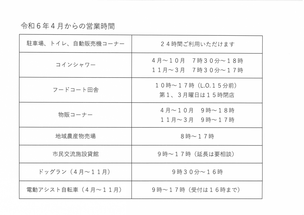 令和6年4月からの営業時間について 2024 3/21 お知らせ 2024.03.21 2024.03.21 4月より、物販コーナー・コインシャワーの営業時間が変更となります。 また、コインシャワー利用料金が200円から300円となります。利用時間は10分間です。 何卒ご理解賜りますようお願い申し上げます。 お知らせ よかったらシェアしてね! URL Copied! URL Copied! 石動高校文化部合同展「iカルチャー展」開催 地域農産物売場よりうれしいお知らせ🌼 関連記事 刑務所作業製品展示即売会開催中 2021.11.23 工事のおしらせ 2024.10.02 紙芝居上演&太鼓演奏会 2022.08.29 ドッグランのお知らせ 2022.03.16 ベジタブル・フルーツカービング作品展 2022.08.12 信州フェア開催中🌰 2023.09.16 よってかれマーケットへ参加! 2022.06.18 施設利用料金変更のお知らせ 2024.02.14