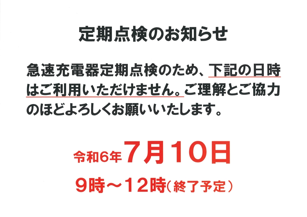 急速充電器点検のお知らせ 2024 7/01 お知らせ 2024.07.01 お知らせ よかったらシェアしてね! URL Copied! URL Copied! 防災フェスティバル開催! 物販コーナーよりおしらせ 関連記事 追記!美味しいお知らせ🍽 2022.10.15 直売所よりうれしいお知らせ🍠 2023.10.18 9/13 信州フェアスタート🍏 2025.08.31 ドッグランのお知らせ 2023.03.06 おやべ元気ボックス受付中📦 2025.11.25 外構修繕工事のお知らせ※追記あり 2024.03.07 刑務所作業製品展示即売会開始! 2022.08.27 ドッグランのお知らせ🐶 2023.03.31