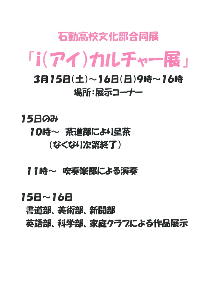 石動高校文化部合同展開催🖼 2025 3/11 イベント情報 2025.03.11 2025.03.11 石動高校文化部の生徒さんによる 文化部合同展「i(アイ)カルチャー展」を開催いたします。 日ごろの成果が発揮される2日間! 生徒さんたちの頑張りを、ぜひご覧ください! 開催日:3月15日(土)~16日(日)9時~16時 イベント情報 よかったらシェアしてね! URL Copied! URL Copied! ドッグラン再開について🐶 3/29土 ドッグラン再開🐶 関連記事 暑いですが、青空古本市開催!📚 2023.08.01 フルーツサンド「果々」&カレーパン「カリット」がやってくる! 2022.03.20 ジャンボかぼちゃ!重量当てクイズ開催中。 2022.08.07 浮世絵展開催中 2022.04.03 音楽イベントのお知らせ 2025.07.05 音楽イベントのお知らせ 2023.11.06 信州フェア開催🍎 2022.09.13 イベントのお知らせ 2024.07.27