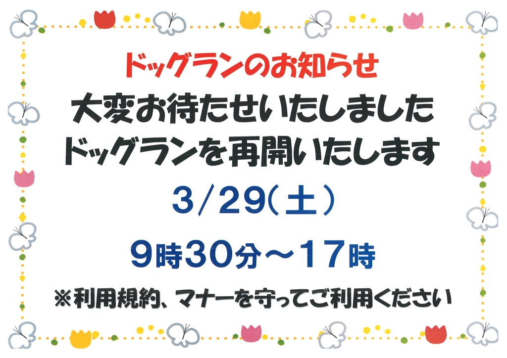3/29土 ドッグラン再開🐶 2025 3/28 お知らせ 2025.03.28 2025.03.28 大変お待たせいたしました。バイオトイレの修理が完了いたしましたので営業を再開いたします。 みなさまが快適に利用できるよう、利用規約、マナーを守ってご利用ください。 どうぞご協力をお願いいたします。 お知らせ よかったらシェアしてね! URL Copied! URL Copied! 石動高校文化部合同展開催🖼 ワークショップのお知らせ🌷 関連記事 記念切符販売中🎫 2021.11.23 ドッグラン冬期閉鎖のお知らせ 2023.11.18 ミスターシェフのサンドイッチがやってくる! 2023.05.17 9/13 信州フェアスタート🍏 2025.08.31 道の駅記念きっぷ🎫 2022.07.26 ドッグランのお知らせ 2023.07.24 コインシャワー点検のお知らせ 2024.05.21 物販、コインシャワー営業時間変更のお知らせ 2024.10.29