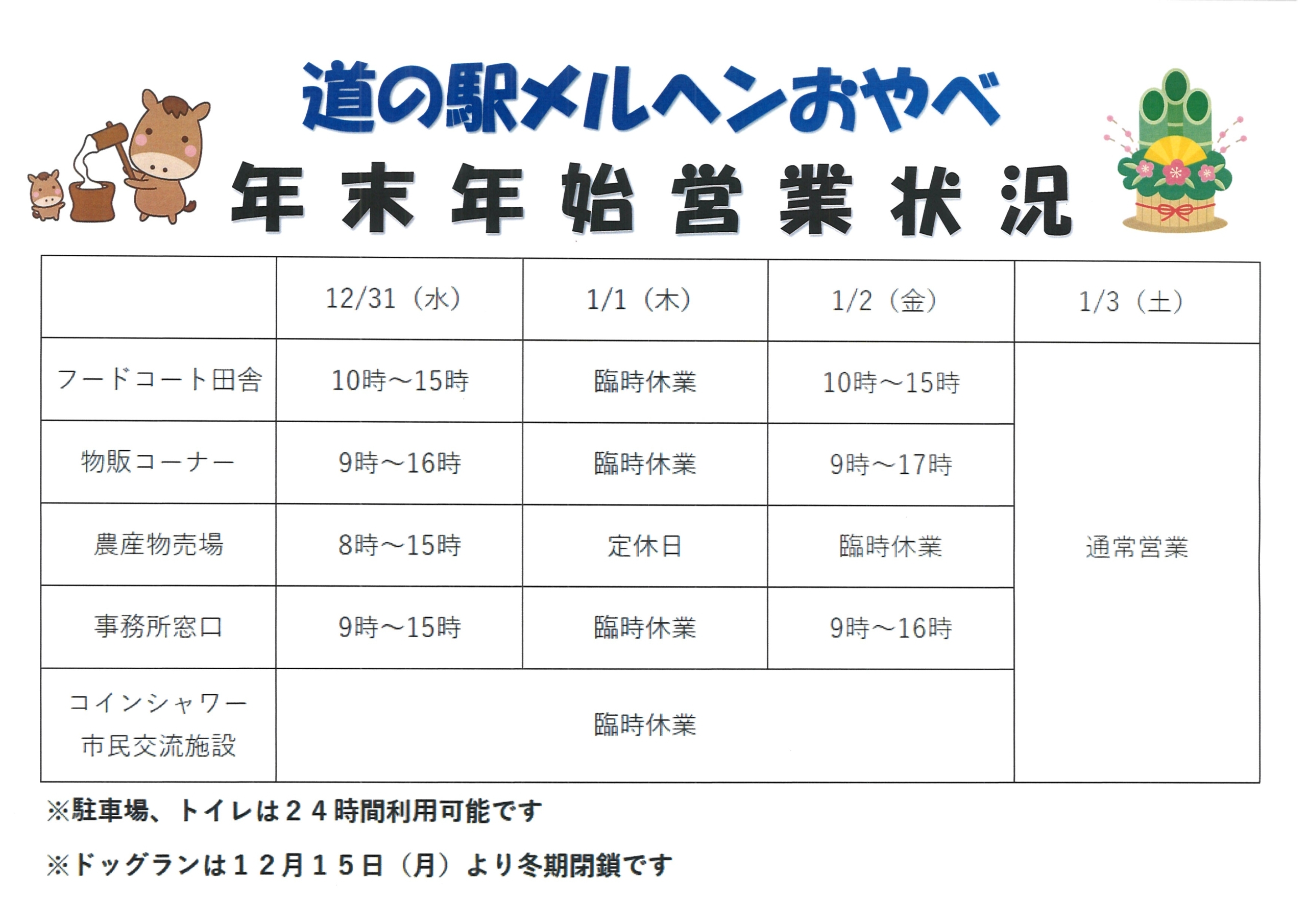 ゴールデンウィーク期間中の営業時間のお知らせ 2025 4/20 お知らせ 2025.04.20 2025.04.20 お知らせ よかったらシェアしてね! URL Copied! URL Copied! ワークショップのお知らせ🌷 GWは地域農産物売場へ🌼 関連記事 道の駅きっぷのお知らせ 2022.09.13 物販コーナーよりおしらせ 2024.07.23 営業時間のお知らせ 2023.02.25 年末年始営業状況のご案内 2025.12.07 トイレ内電気工事のお知らせ 2024.06.04 1月8日開催予定の[新年道の駅メルヘンおやべからLive]中止のご案内 2022.01.07 ドッグランのお知らせ 2022.03.16 みんなでうたわんまいけ♪ 2023.09.25