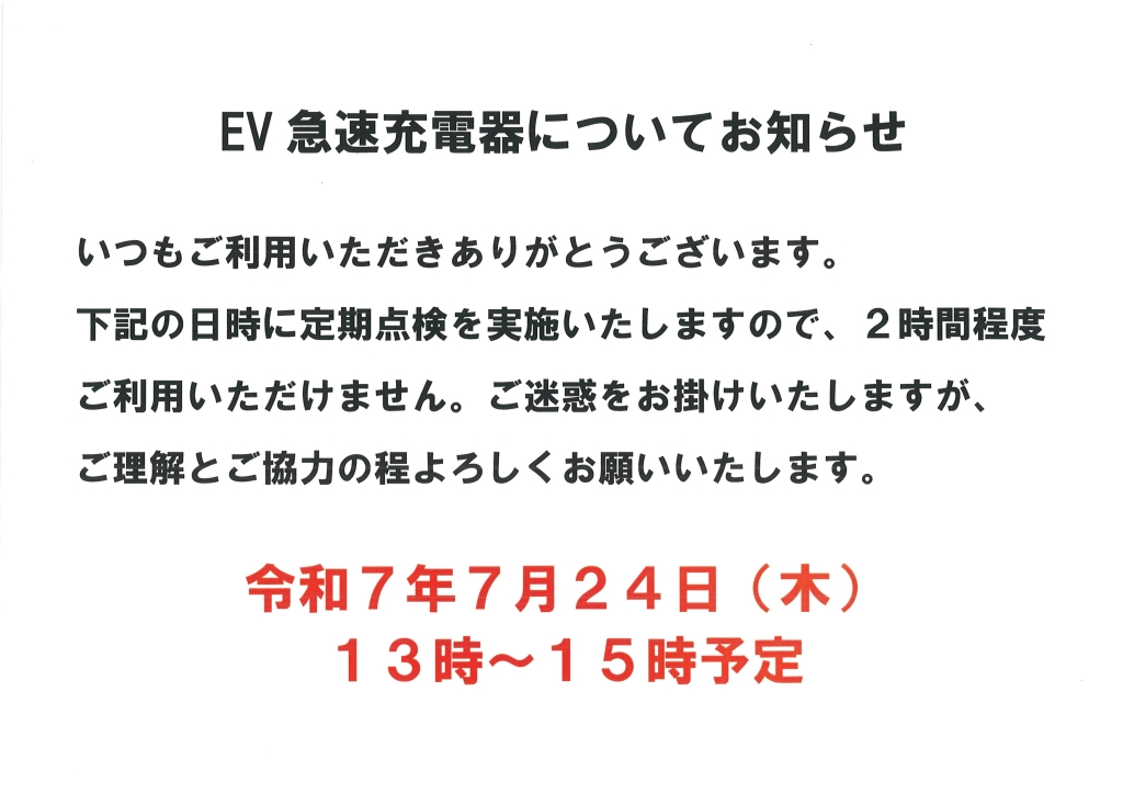 急速充電器についてお知らせ 2025 7/04 お知らせ 2025.07.04 2025.07.04 7/24(木)13時~15時に定期点検を実施いたします。 お知らせ よかったらシェアしてね! URL Copied! URL Copied! 6/1(日) ありがとうマルシェ開催♪ 音楽イベントのお知らせ 関連記事 信州フェア開催中🌰 2023.09.16 工事のおしらせ 2024.10.02 クマにご注意を! 2024.06.07 年末年始の営業についてお知らせ🎍 2024.12.10 営業状況について 2024.01.07 ドッグランのお知らせ 2022.04.01 刑務所作業製品展示即売会開催中 2021.11.23 急速充電器点検のお知らせ 2024.07.01
