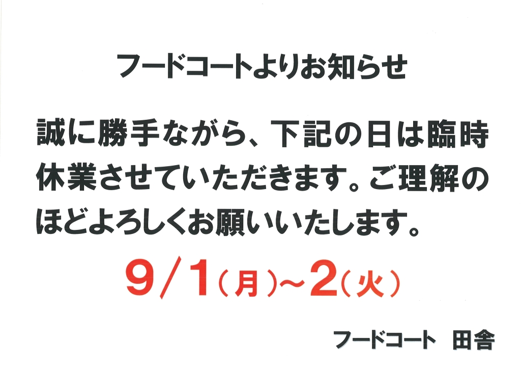 フードコート臨時休業のお知らせ 2025 8/19 お知らせ 2025.08.19 お知らせ よかったらシェアしてね! URL Copied! URL Copied! 夏休みだ!カブト虫だ! 9/13 信州フェアスタート🍏 関連記事 物販コーナーよりお知らせ 2024.09.12 ミスターシェフのサンドイッチがやってくる! 2023.05.17 物販コーナーよりおしらせ 2024.07.23 刑務所作業製品展示即売会開催中 2021.11.23 年末年始のご案内 2022.12.19 ドッグランのお知らせ 2021.11.21 ドッグランのお知らせ🐶 2023.03.31 ドッグラン利用について 2021.04.01