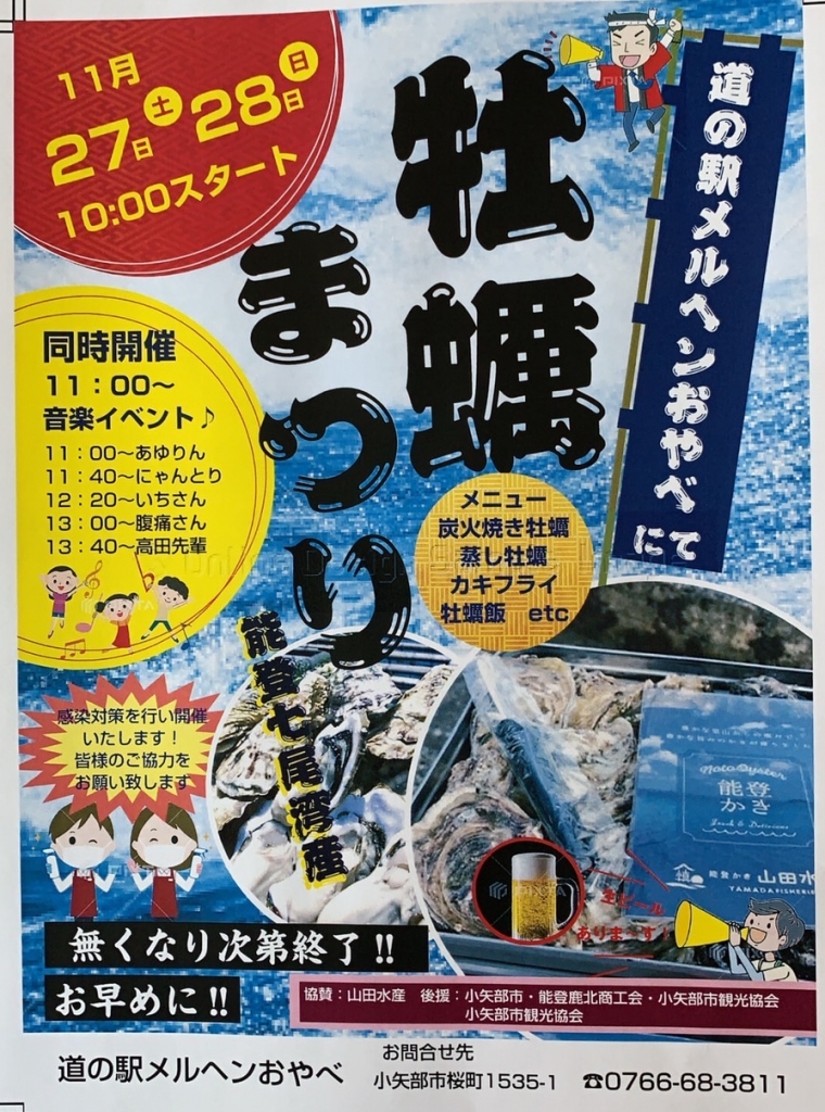 道の駅メルヘンおやべにて「牡蠣まつり」開催!!音楽イベントも同時開催!ぜひご来店ください。道の駅メルヘンおやべ「牡蠣まつり」令和3年11月27日(土)~28日(日)10時スタート